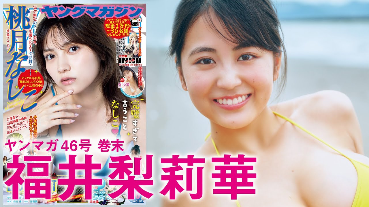 2024年10月11日(金)発売の週刊ヤングマガジンNo.46巻末グラビアに福井梨莉華さんが初登場!グラビアメイキング動画!水着姿を披露!Tシャツをまくり上げて白ビキニ水着姿披露、黄色紐パンビキニ水着姿、青白ボーダー柄ビキニ水着姿で椅子に座ってポージングシーン、白ビキニ水着姿、チューブトップ水着姿の入浴シーンなど!